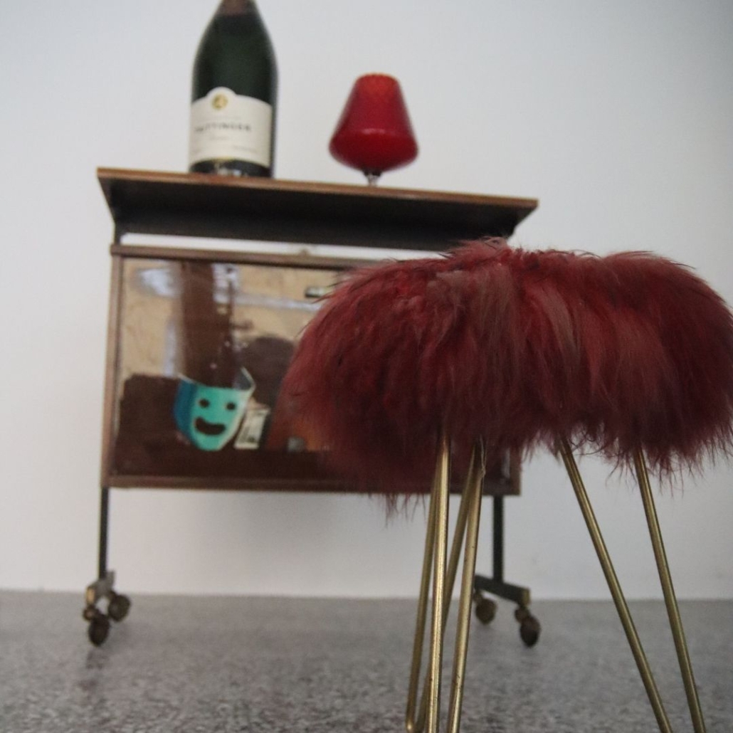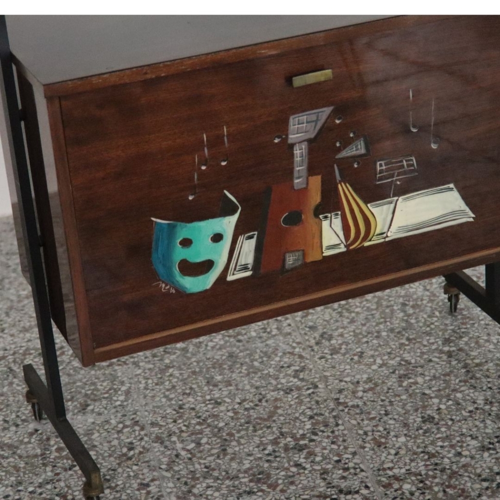 Home is where your Minibar is – Minibar, Italien um 1955. Barschrank auf Rollen. Tür klappt nach unten auf.