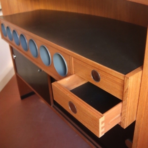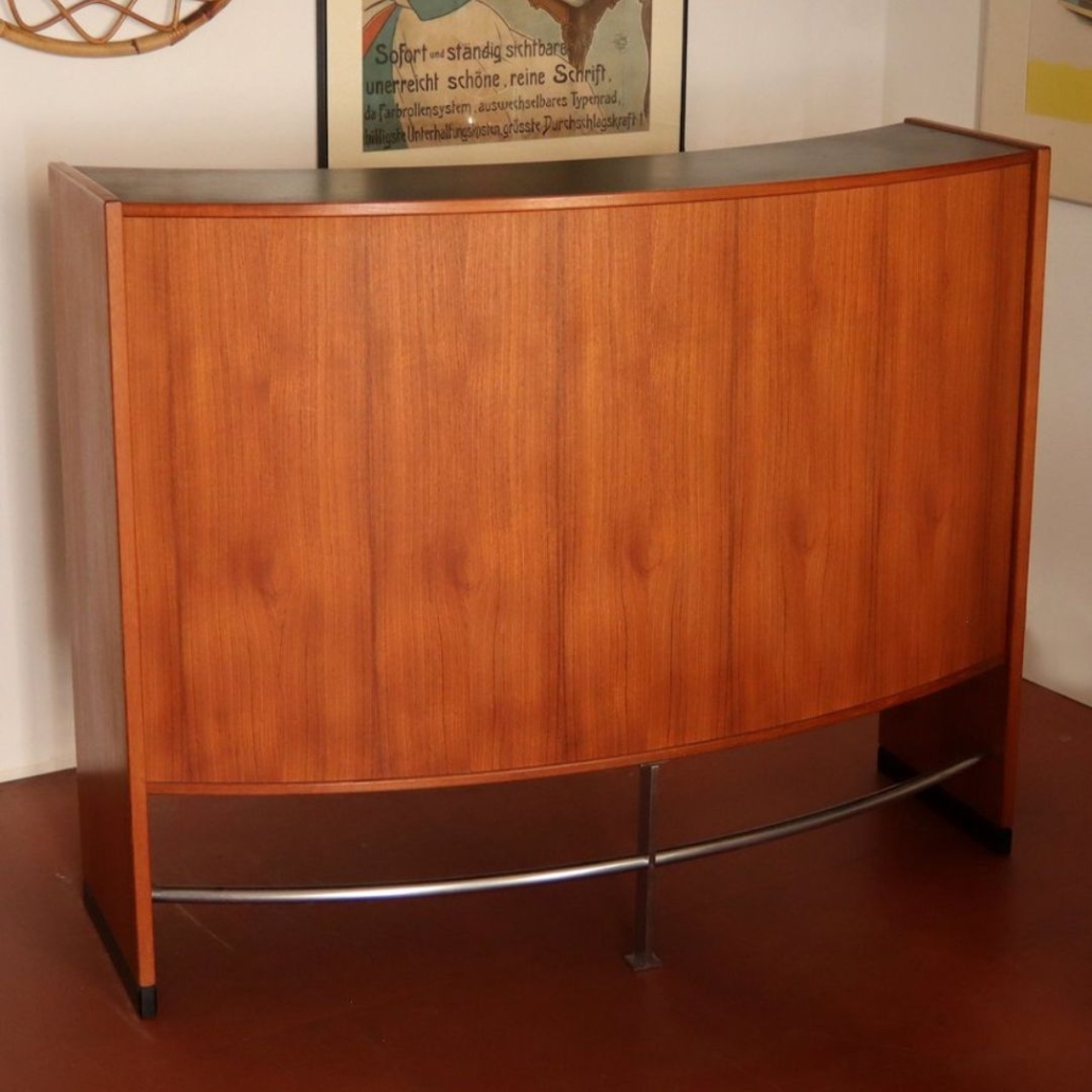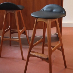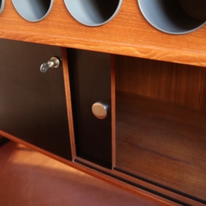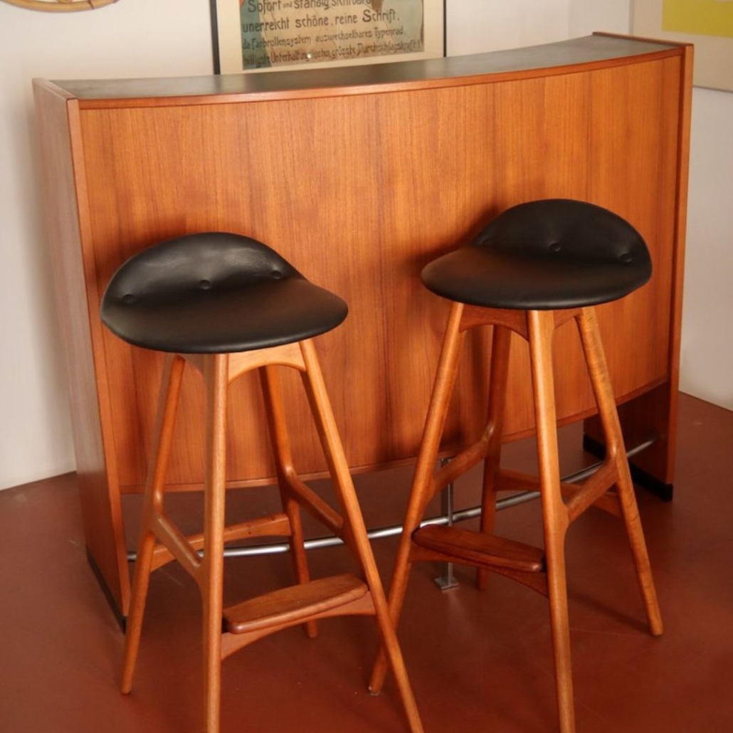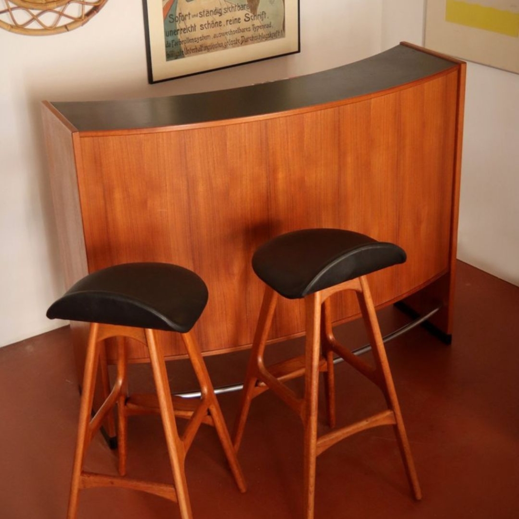 Sehr raffinierter, freistehender Barschrank mit 2 Barhocker, entworfen von Erik Buch für Dyrlund, Dänemark 1960. Sehr guter Zustand, Hocker neu tapeziert.