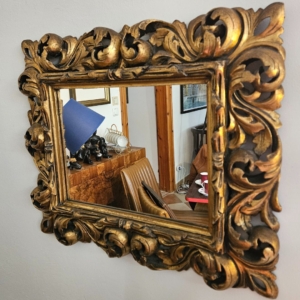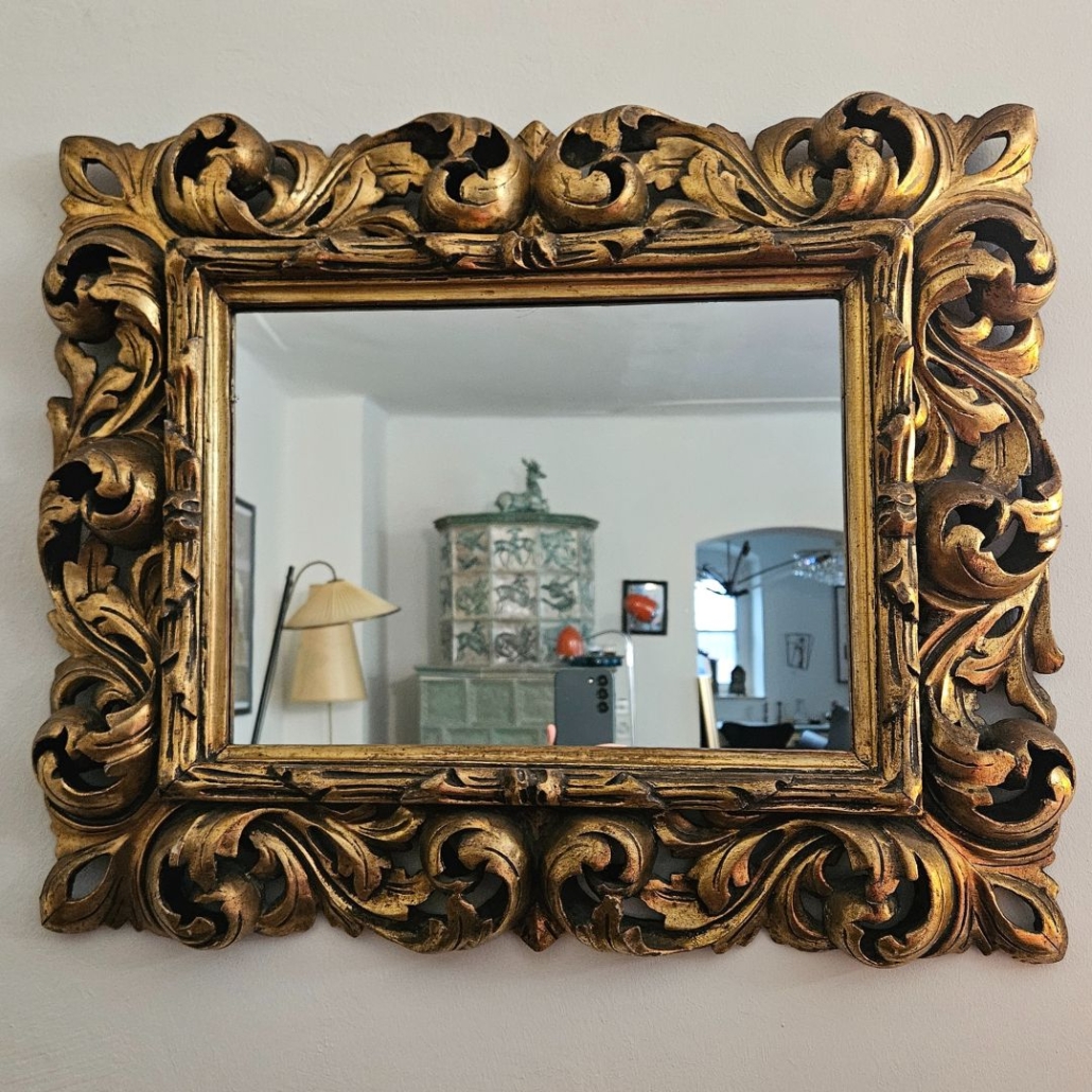 Vergoldeter geschnitzter Spiegel, Spiegel erneuert. Zwei Stück verfügbar. Kann als Hoch- oder Querformat gehängt werden.