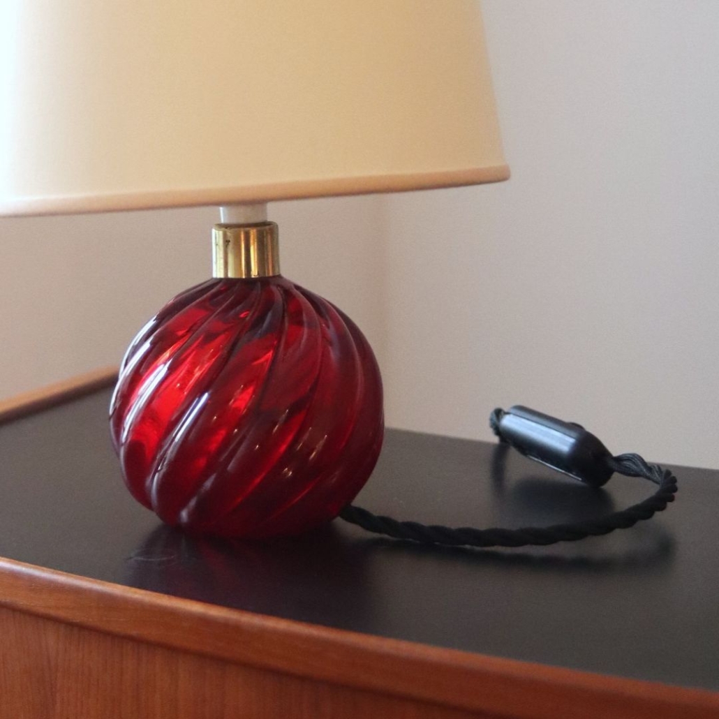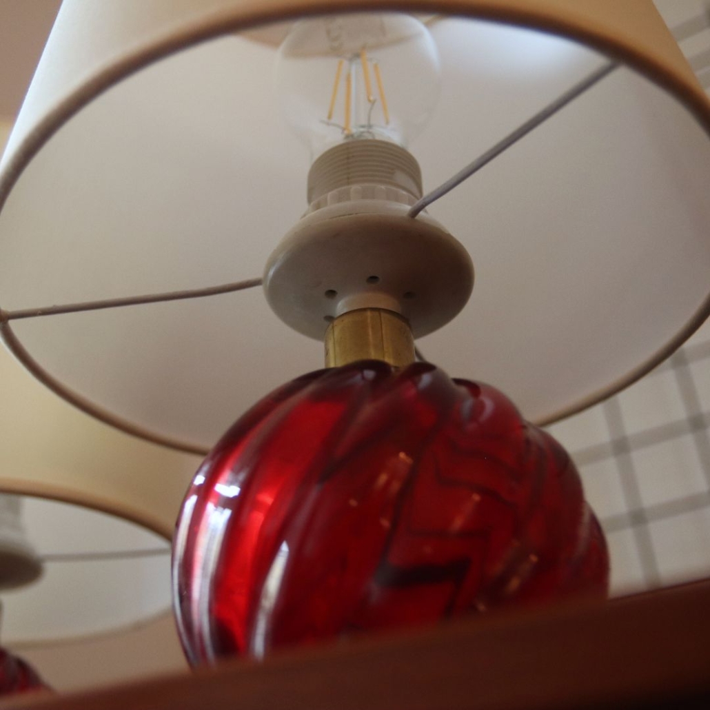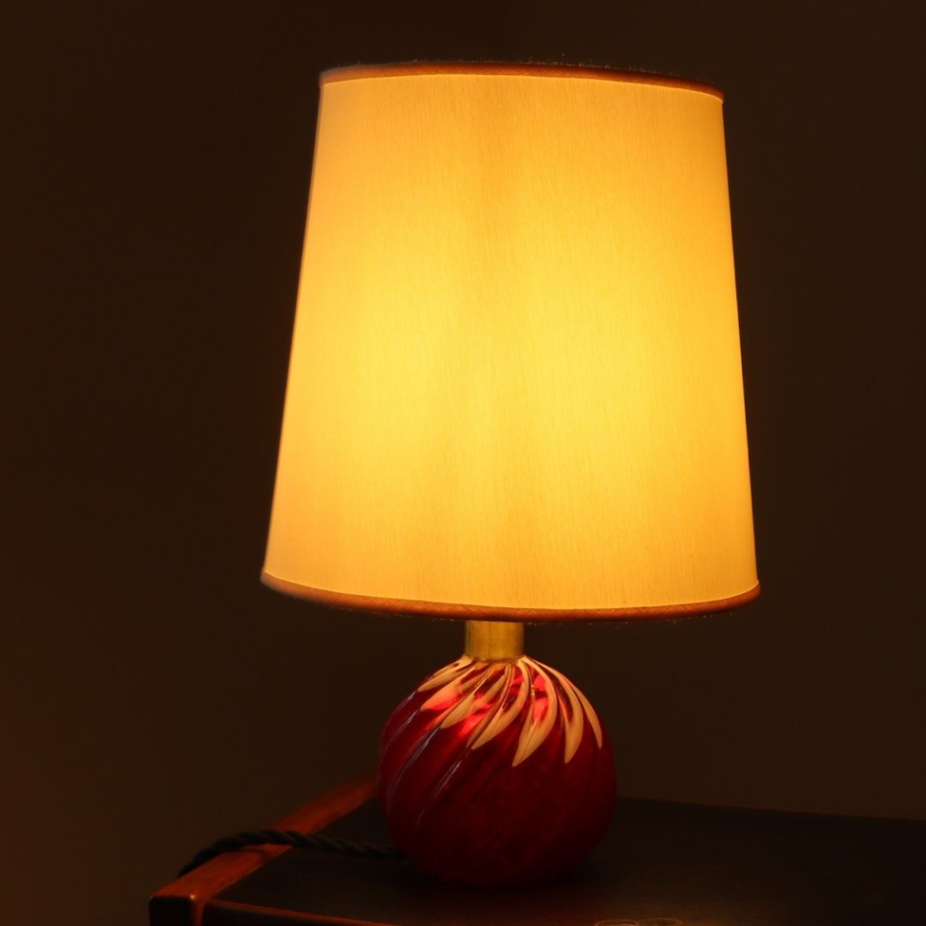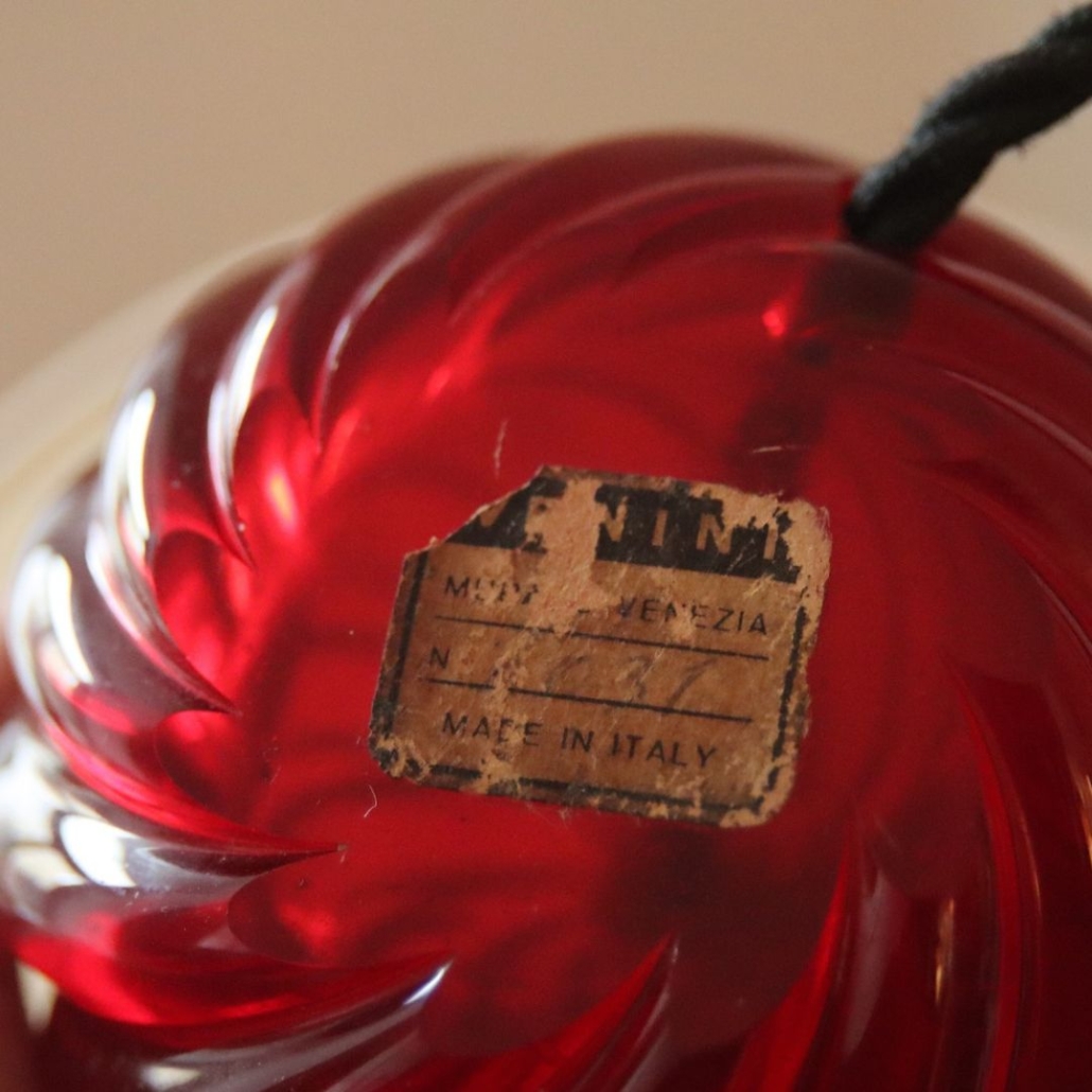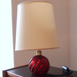Der kugelförmige Lampenfuß besteht aus handgeblasenem Glas in kräftigem Rubinrot mit spiralförmiger „Diamante“-Struktur, die das Licht besonders schön reflektiert. Die Kombination aus italienischer Handwerkskunst und klassischem Design macht diese Lampe zu einem echten Highlight auf jedem Sideboard oder Nachttisch. Sehr guter Zustand, Lampenschirm und Kabel erneuert.